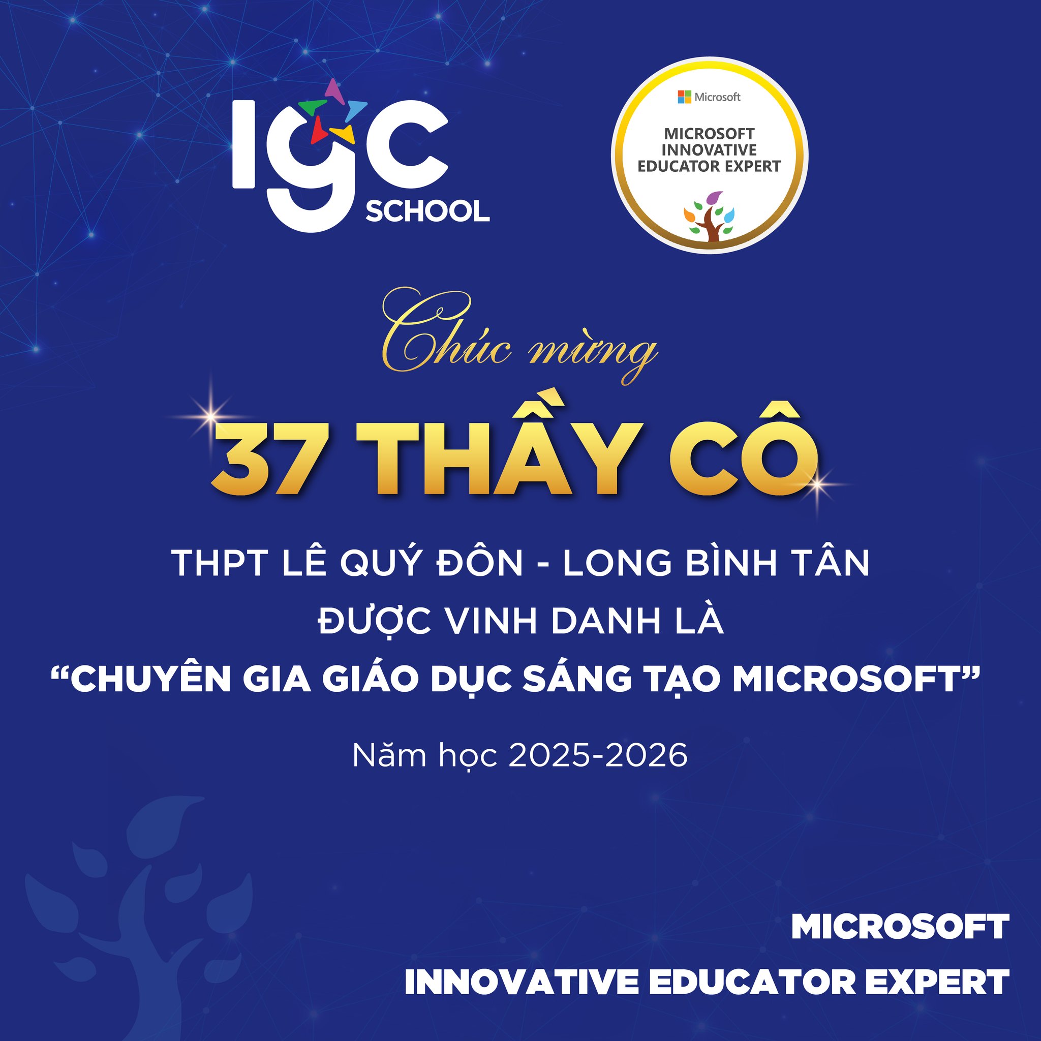 Đặc biệt, 4 thành viên Ban Giám Hiệu và 33 giáo viên đã vinh dự được công nhận là “Chuyên gia Giáo dục Sáng tạo Microsoft – MIEE 2025”. Đây là niềm tự hào to lớn, khẳng định tinh thần tiên phong và sự tận tâm cống hiến của đội ngũ thầy cô trên hành trình đổi mới giáo dục.